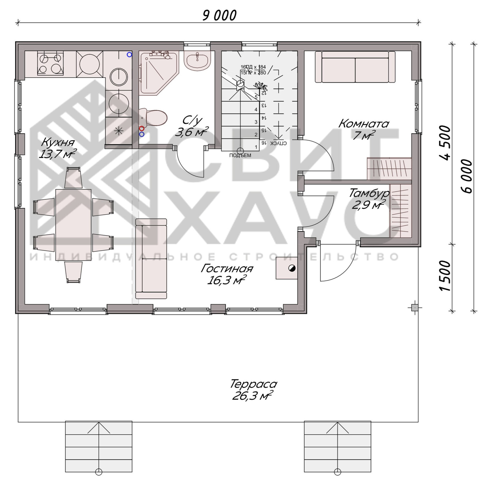 Как и все наши проекты, дом можно отзеркалить, развернуть одно из крыльев, изменить площадь, поменять размеры и расположение окон, форму кровли, материалы отделки и назначение помещений. А так же выполнить все коммуникации (открытым или скрытым способом), плиточные работы и окрашивание.