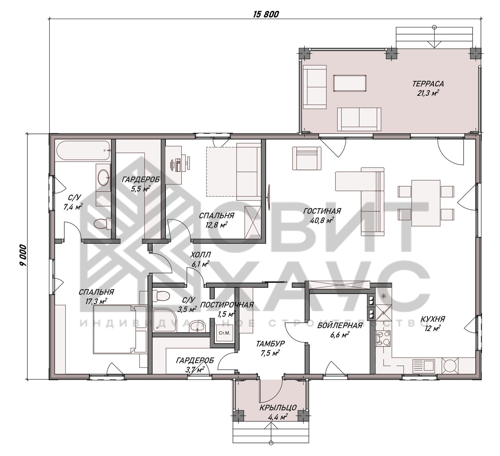 В планировочном решении предусмотрены все необходимые помещения для комфортной загородной жизни. Просторная гостиная, совмещенная с кухней, расположена в боковой части дома. Зона для приготовления пищи спроектирована в отдалении от жилых комнат, чтобы кухонные запахи не проникали в спальни. Благодаря большой площади помещения вы можете обустроить единое пространство для отдыха, приготовления и приема пищи так, как пожелаете. Из гостиной есть выход на террасу. В доме две комнаты, одна из них – мастер-спальня с большим санузлом и вместительной гардеробной. Еще одна спальня может использоваться как детская, гостевая или кабинет. Также в проекте предусмотрено техническое помещение – бойлерная. В тамбуре дома расположена общая гардеробная для удобного хранения верхней одежды. Мигель – дом, в котором каждая комната и уголок продуманы для того, чтобы вы могли наслаждаться жизнью и не думать о мелочах.